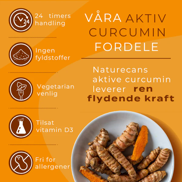 Leder du efter en naturlig måde at holde dig energisk og støtte din krop hver dag? Vores Active Curcumin-kapsler indeholder 500 mg hurtigt absorberende NovaSOL®-curcumin sammen med din daglige dosis D3-vitamin, så du kan bevæge dig, føle dig og leve bedre.